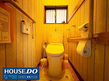 【便利な手すり付きトイレ】温かみのある壁紙が落ち着くトイレ。便利な手すりが付いているので、お子さまからご年配の方まで、安心して使用できますね。