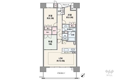 •  間取りは専有面積74.41平米の3LDK。LDK約16.9帖の横長リビングのプラン。バルコニー面積は15.75平米です。