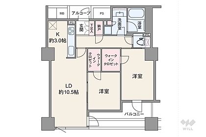 間取りは専有面積64.95平米の2LDK。LDK約14.4帖のプラン。バルコニー面積は8.8平米です。