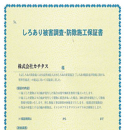 シロアリ防除には5年間の保証付き(施工日から。 施工箇所のみ施工会社による保証)。さらに計2回 の無料点検もあります。