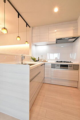 収納豊富な最新システムキッチン!家具と調和する扉面材と使い勝手のよいスライド収納です♪家事が楽になる食洗器付き!ワークトップは高級感のある人造大理石仕上げ!浄水器付き水栓も付いています!