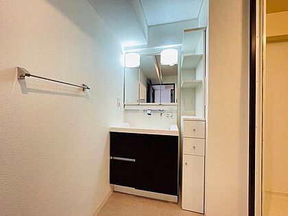 壁付け水栓の洗面台は洗面ボウルを広く使えるため、寝ぐせ直しなどの朝の準備がしやすいです♪