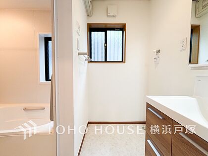 【Powder room】脱衣スペースを含む空間はゆとりの広さを設け、また洗面化粧台にも収納スペースを設ける事により、散らかりやすい洗面スペースをスッキリ保てます。