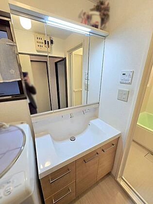 三面鏡タイプの洗面台は、シャンプードレッサー付きです。朝のスタイリング時に役立ちます♪