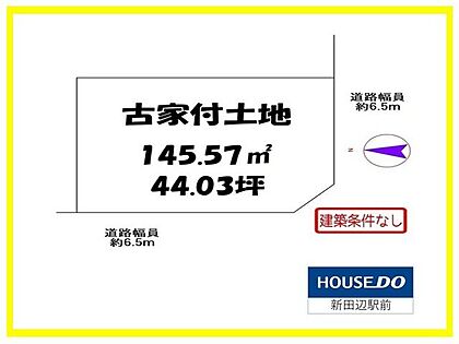 | 土地面積/坪(坪単価) | 145.57m2(登記簿)/44.11坪(54.00万円) | 代表的な接道 | 角地 公道 西 6.5m、南 6.5m ※詳細は備考欄をご確認ください |