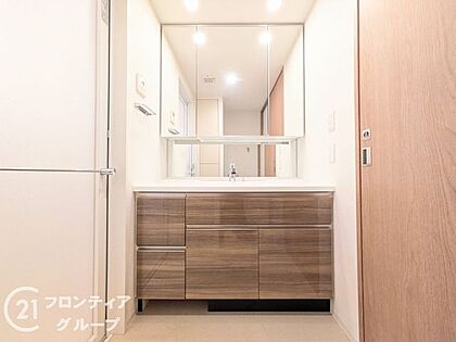明るく開放的な洗面空間は、家族みんなが使いやすい配置とゆとりのある設計。洗濯機置き場も近く、家事の効率もアップ。落ち着いた色調と使いやすさを兼ね備えた空間で、日々の暮らしをスマートに演出します。