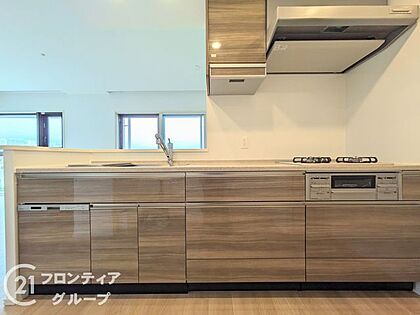 明るく広々としたキッチンは、料理がしやすい動線を考慮した設計。使い勝手の良い収納が豊富で、効率よく作業できます。シンプルなデザインながら機能性を兼ね備え、快適な調理空間を提供します。