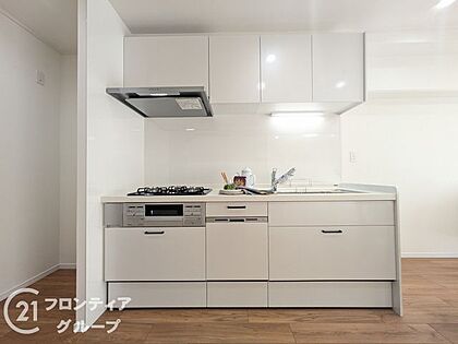 明るく広々としたキッチンは、料理がしやすい動線を考慮した設計。使い勝手の良い収納が豊富で、効率よく作業できます。シンプルなデザインながら機能性を兼ね備え、快適な調理空間を提供します。