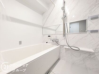 心も体もリフレッシュできるバスルームは、明るい配色と機能的な設備が魅力。清掃もしやすく、家族の入浴時間を快適にサポートしてくれます。明るく開放的な空間で、リフレッシュできるひとときをお楽しみください。
