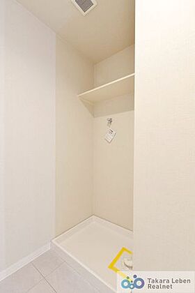 洗濯機置き場の上部には収納棚を設置。洗剤や掃除用具などもスッキリ収納できます。