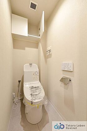 ウォシュレット機能付きのトイレは壁掛けリモコンの上位グレードを採用。便座がスッキリした印象となり、限られた空間を広く見せる効果があります。