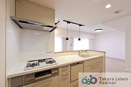 嬉しい3口コンロ。ビルトイン食器洗浄機の為場所を取らず忙しい朝も快適になります。また、収納はスライド式の為、奥にしまい込んだ調理器具等の取り出しもスムーズに行えるため、調理がはかどりますね