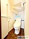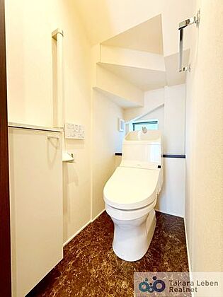 2階、ウォシュレット機能付きトイレ。ウォシュレット機能付きのトイレは壁掛けリモコンの上位グレードを採用。便座がスッキリした印象となり、限られた空間を広く見せる効果があります。