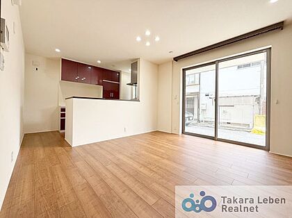1階、リビング。キッチンからリビング全体を見渡すことができます。各居室では独立性を保ちながらも、リビングでは家族が一緒に寛げる空間に。お子様が成長した後も、大切な時間をお過ごしいただけますね。