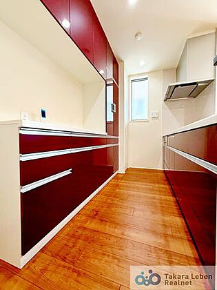 1階、システムキッチン。炊飯器・電子レンジが置けるスペース有。ティーカップや食器、食品ストックも収納できるお洒落な食器棚付きです。
