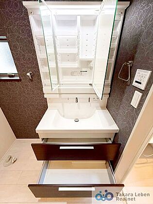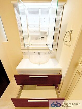 2階、洗面化粧台。気持ちの良い朝はキレイな洗面所から♪化粧台の鏡裏や下部は収納力豊富。モノが出がちな洗面所がスッキリ片付きます。