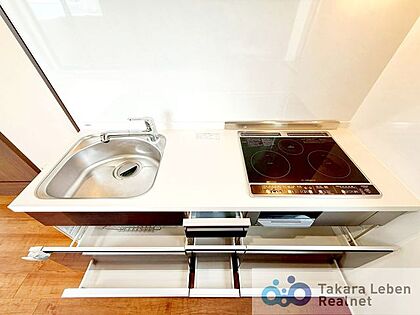 1階、システムキッチン。収納はスライド式の為、奥にしまい込んだ調理器具等の取り出しもスムーズに行えるため、調理がはかどりますね