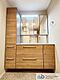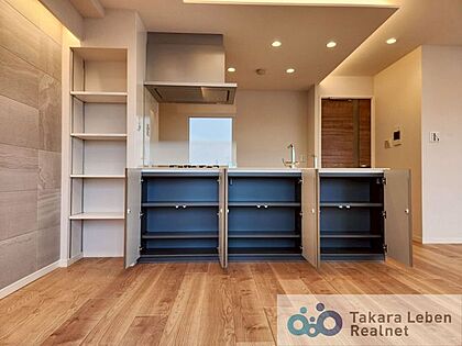 キッチン前とサイドに容量豊富な収納有。サイドの棚は、高さを調節できる可動棚となってます。