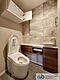 空間を広く感じられるタンクレスの、吊戸棚付き温水洗浄トイレ。ペーパーホルダーは2ロール設置可能です。