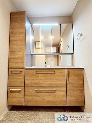 鏡裏やサイドの棚など収納充実の洗面化粧台。小物もサイズに応じて収納出来ます。