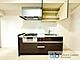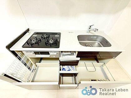•  システムキッチン。収納はスライド式の為、奥にしまい込んだ調理器具等の取り出しもスムーズに行えるため、調理がはかどりますね