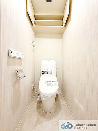•  ウォシュレット機能付きのトイレ。収納付きで、便座がスッキリした印象となり、限られた空間を広く見せる効果があります。