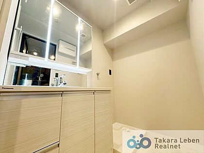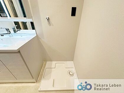洗面台の横には、防水パン付きの洗濯機置き場があり、家事動線に配慮した配置になっています。