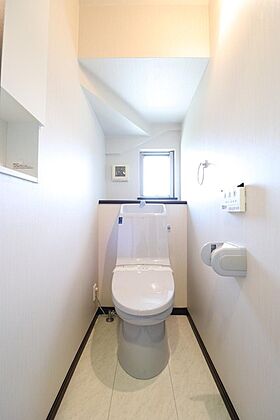 洗浄付き便座が魅力的なトイレです♪毎日使用する場所だからこそ、いつも清潔な空間であって頂けるよう配慮しました。窓で換気はばっちり、デザインもシンプルで清潔感が漂います。