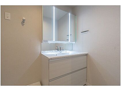 細かなものが多くて雑になりがちなサニタリー。そんな悩みを解決してくれる収納スペース付三面洗面化粧台。