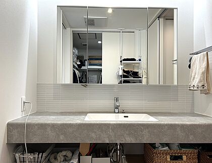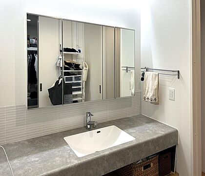 【洗面台】ホテルライクな洗面台で、朝の身支度もスムーズに。広いカウンターと収納力で家族みんなが使いやすいデザインです。