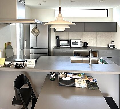 【キッチン】カウンターキッチンに背面カウンターを設置。収納と作業スペースを両立させ、スタイリッシュで機能的なキッチン空間を実現しています。