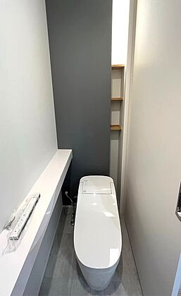 【トイレ】デザイン性の高いトイレ空間で、家族みんなが快適に使えます。掃除しやすく、収納スペースも工夫された便利な仕様です。
