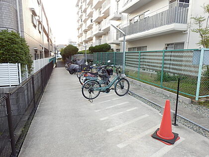 建物南側の自転車置場です。駐輪スペースが多くあるため、ゆったり駐輪する事ができます。区画割は特になく、どこに停めても良い設定です。