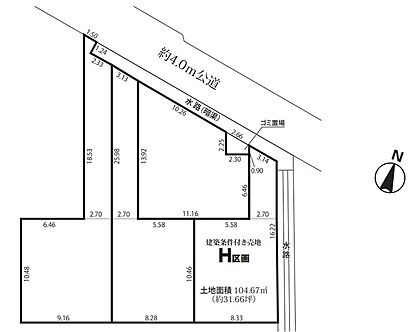 | 土地面積/坪(坪単価) | 104.67m2(登記簿)/31.72坪(71.10万円) | 代表的な接道 | 一方 公道 北 4m ※詳細は備考欄をご確認ください |
