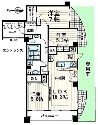 小さなお子様やご年配の方にも安心の1階住戸。南側に広く開放的な専用庭付き、ゆったり過ごせる3LDK。