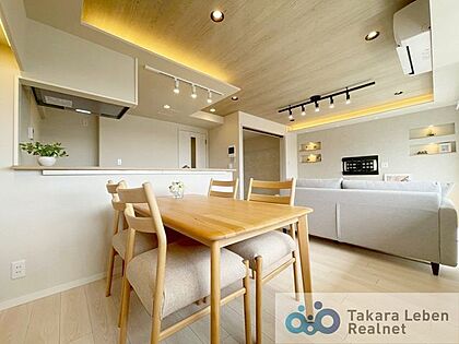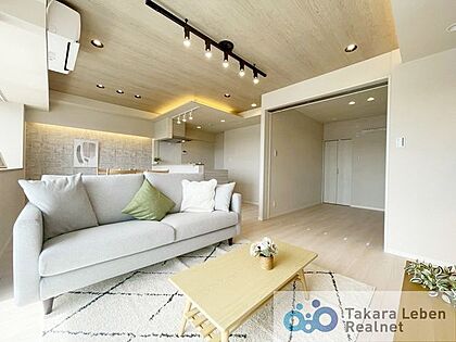リビングとダイニングを分けやすいワイドなLDK。間接照明が優しく照らします。エアコン付き。