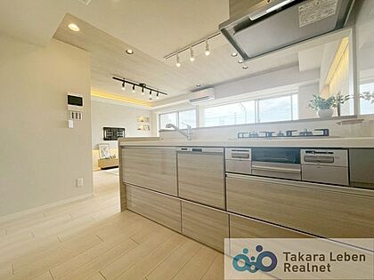 リビングを見渡せる対面式システムキッチン。家事の手間が省ける食器洗浄機付きです。