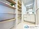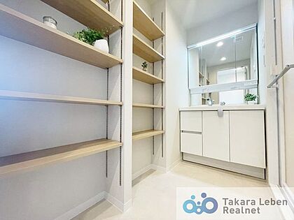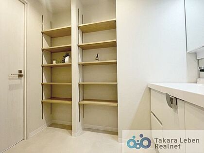 洗面室に高さを調節できる可動棚あり。高さがある大容量の洗剤ストックも保管できます。
