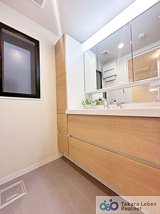 鏡裏にも収納可能な三面鏡洗面化粧台。サイドにも収納があり、綺麗に整頓できる洗面室です。