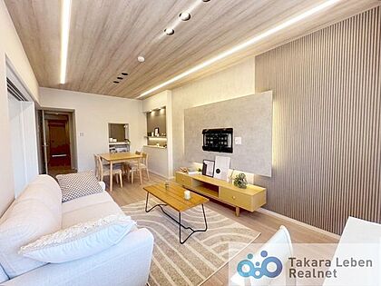 約15.5帖のLDK。天井にも柔らかい木目調のアクセントクロスを使用した、居心地の良いリビングです。