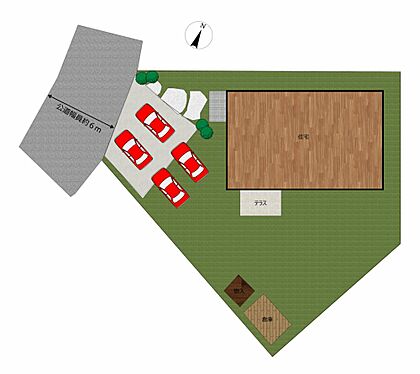 【区画図】駐車場は土間打ち部分が並列2台分、庭部分にも停められるため、並縦列4台駐車可能です。お庭も広いため、お庭でご家族団らんな時間を過ごすことができます。