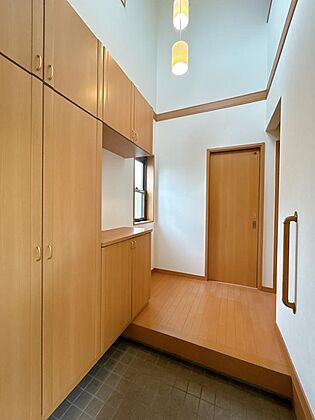 【リフォーム中 2025/9/25撮影】玄関内観の写真です。収納力のあるシューズボックスがついている、吹き抜けの開放的な玄関です。壁に手すりがついているため、玄関にあがる際にも楽に上がることができます