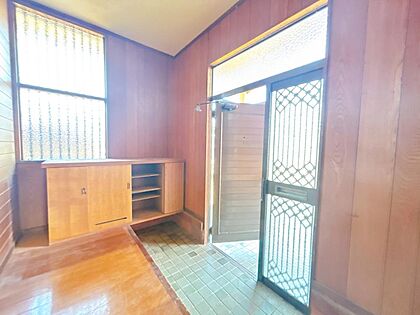 【リフォーム中】玄関です。シューズボックス交換、玄関ドア交換、玄関タイルはシートを上張りします。