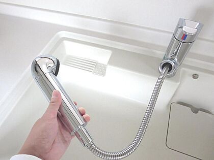 【同仕様写真】新品交換予定のキッチンの水栓金具はノズルが伸びてシンクのお手入れもラクラクです。