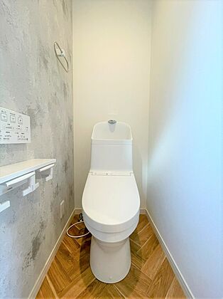 フチレス形状でお掃除ラクラク!強力洗浄の節水トイレ(3日でお風呂1杯以上の節水効果)!ノズルシャッターがついて清潔に保てます。1階2階でアクセントクロスが違います。※同社施工イメージ
