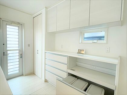 カップボードは、キッチンと同色で統一感があります。収納たっぷり!吊戸棚は震度3以上の揺れでロックがかかる安全仕様!※同社施工イメージ