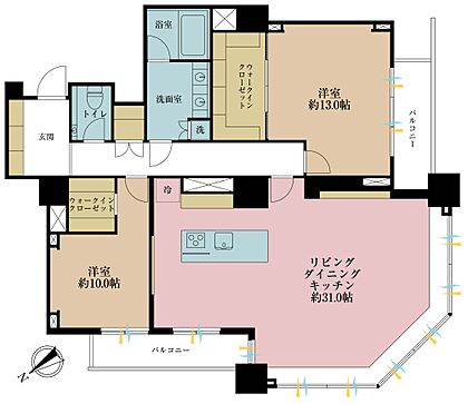 2LDK、専有面積75.77m2、バルコニー面積7.21m2