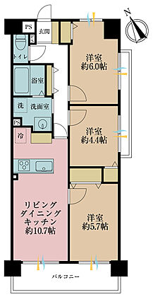3LDK、専有面積61.4?、バルコニー面積7.47?