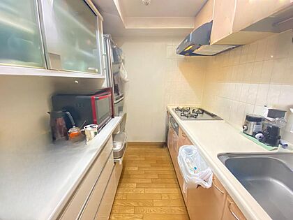 吊り戸棚もあり収納豊富なキッチン。調理器具を沢山収納できます。また三口コンロのため料理も捗ります♪
