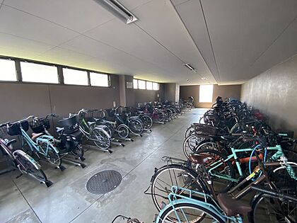 駐輪場。室内のため雨や風などから大切な自転車を守ることが出来ます!転倒防止の車輪止めもあり快適◎